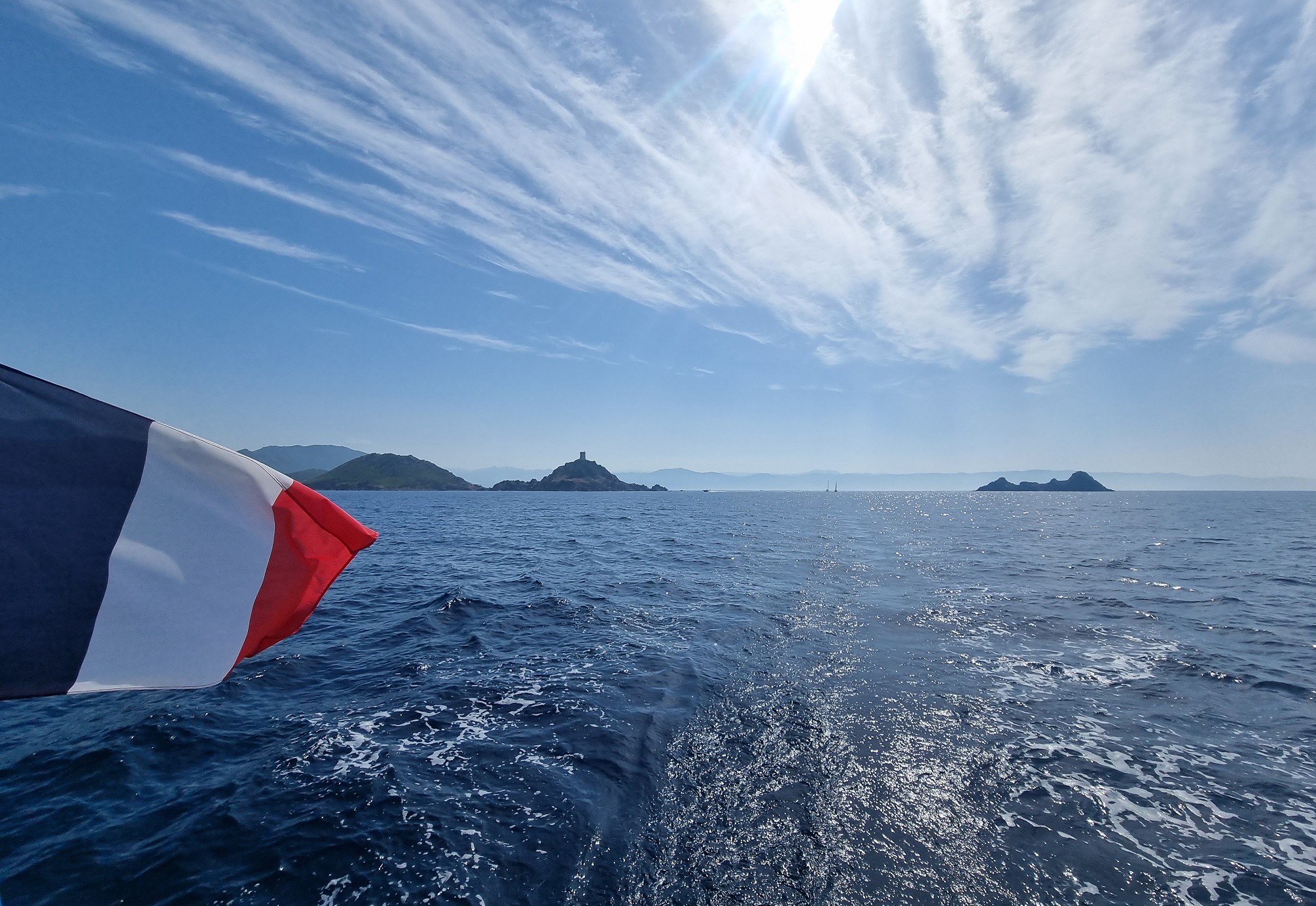 Après 30 heures de navigation dont la grande partie au moteur, nous pouvons voir les îles que nous connaissons bien, Porquerolles, Bagaud, Port Cros et l’île du Levant. Nous mouillons dans les eaux claires de cette dernière. Il est aujourd’hui difficile de mouiller à Port Cros et Bagaud sans payer une bouée (si toute fois vous arrivez en réserver une) ou s’entasser dans la crique de Port Man. Ici, à l’île du Levant, il doit y avoir un micro-climat car les gens ont tellement chaud qu’ils y vivent nus !!! Et cela depuis bientôt cent ans ! Je vous rassure, nous le savions…